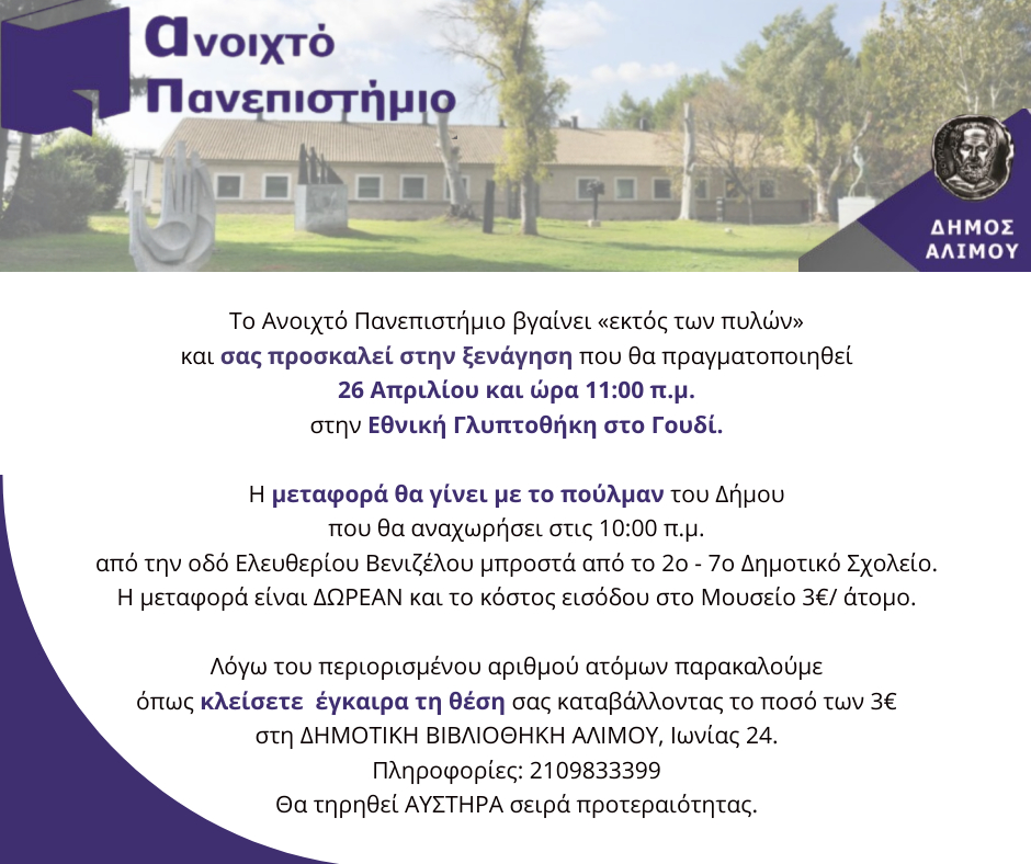 Το Ανοιχτό Πανεπιστήμιο Αλίμου βγαίνει «εκτός των πυλών» και προσκαλεί τους πολίτες σε μία ξενάγηση, που θα πραγματοποιηθεί στις 26 Απριλίου και ώρα 11:00 π.μ., στην Εθνική Γλυπτοθήκη στο Γουδί.