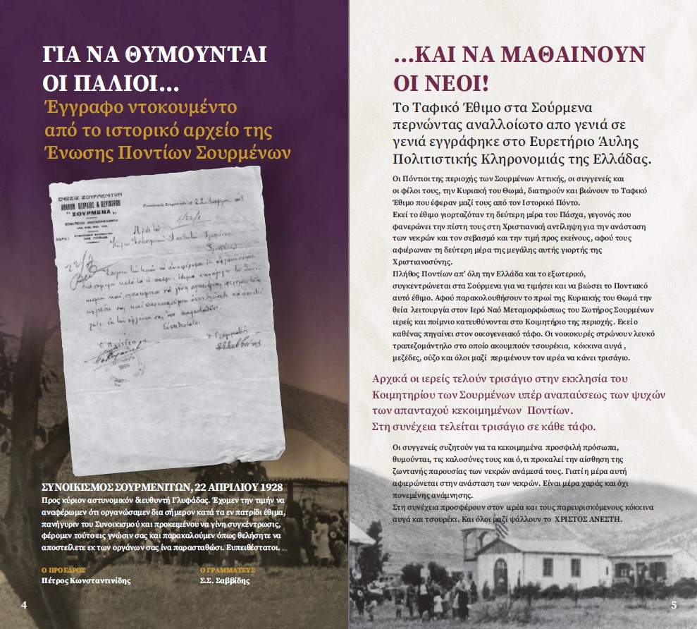 Οι Πόντιοι της περιοχής των Σουρμένων Αττικής, οι συγγενείς και οι φίλοι τους, την Κυριακή του Θωμά, διατηρούν και αναβιώνουν, εδώ και 101 χρόνια, το Ταφικό Έθιμο που έφεραν μαζί τους από τον Ιστορικό Πόντο.