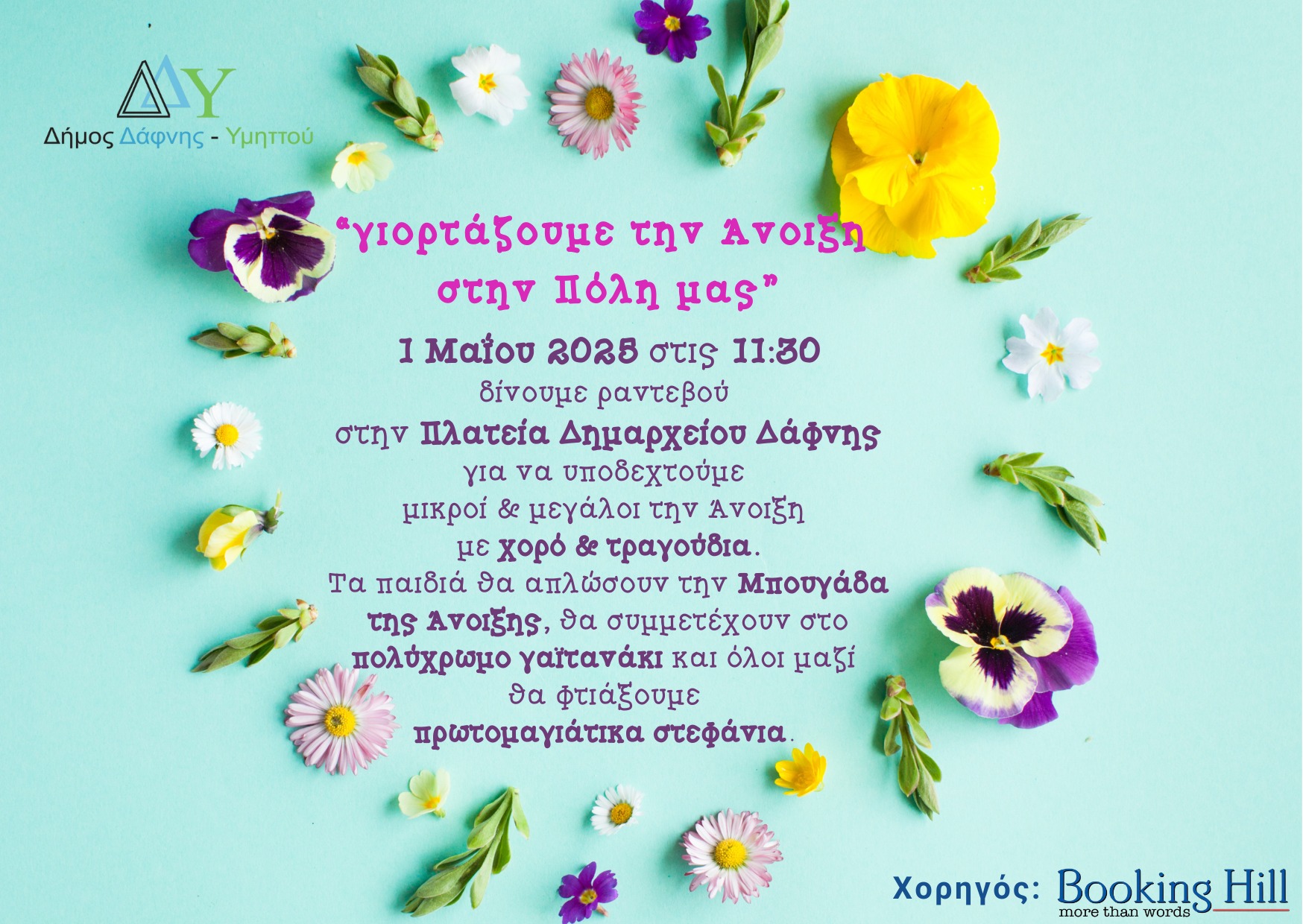 Ο Δήμος Δάφνης-Υμηττού διοργανώνει μία ανοιξιάτικη γιορτή τους δημότες, για να γιορτάσουν όλοι μαζί την Πρωτομαγιά στην πόλη, με τίτλο «Γιορτάζουμε την άνοιξη στην πόλη μας».