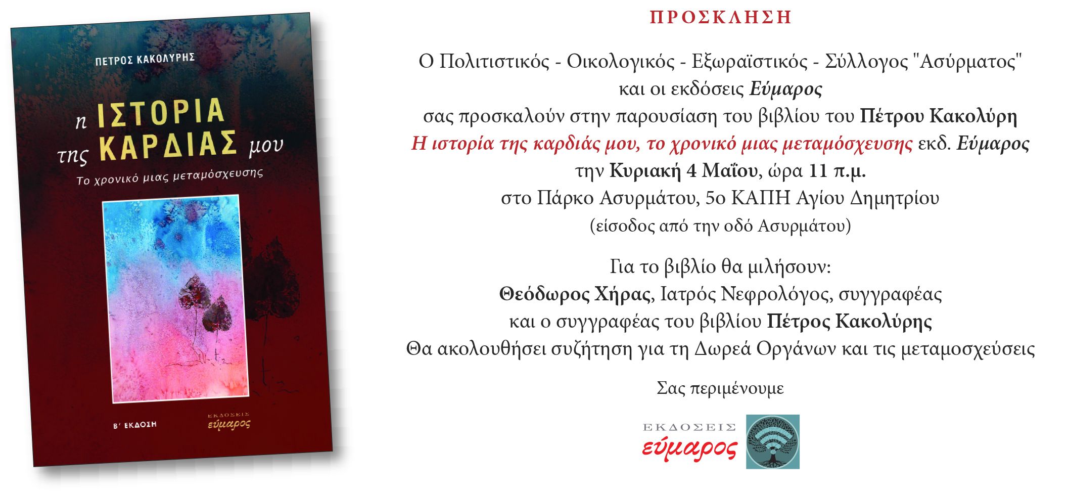 Ο Πολιτιστικός και Εξωραϊστικός Οικολογικός Σύλλογος «Ασύρματος» διοργανώνει άλλη μία παρουσίαση βιβλίου, όπου θα συζητηθεί ένα πολύ ευαίσθητο θέμα, με αφορμή το βιβλίο «Η ιστορία της καρδιάς μου, το χρονικό μιας μεταμόσχευσης», του Πέτρου Κακολύρη, από τις Εκδόσεις Εύμαρος.