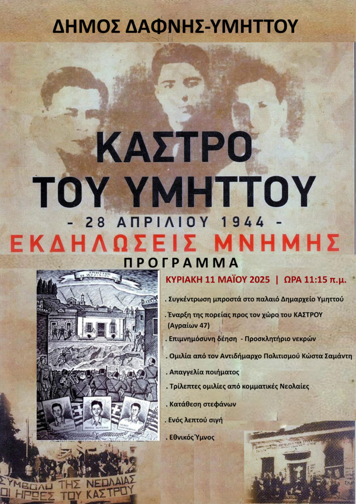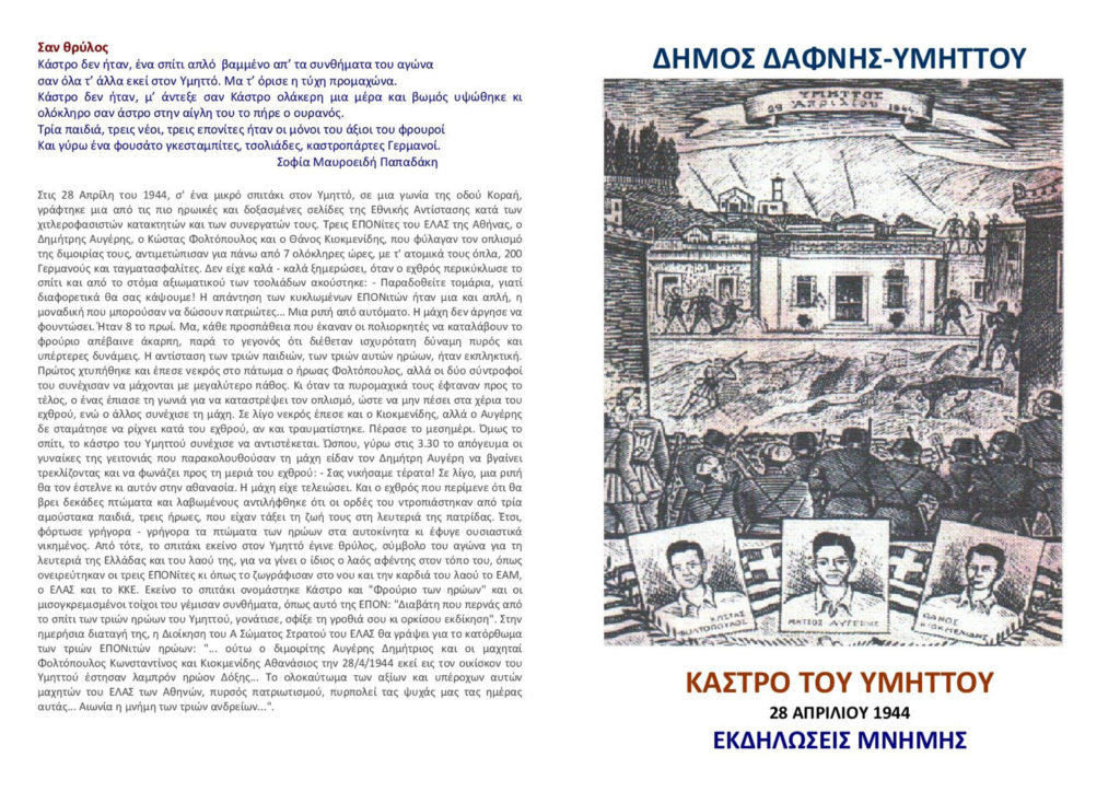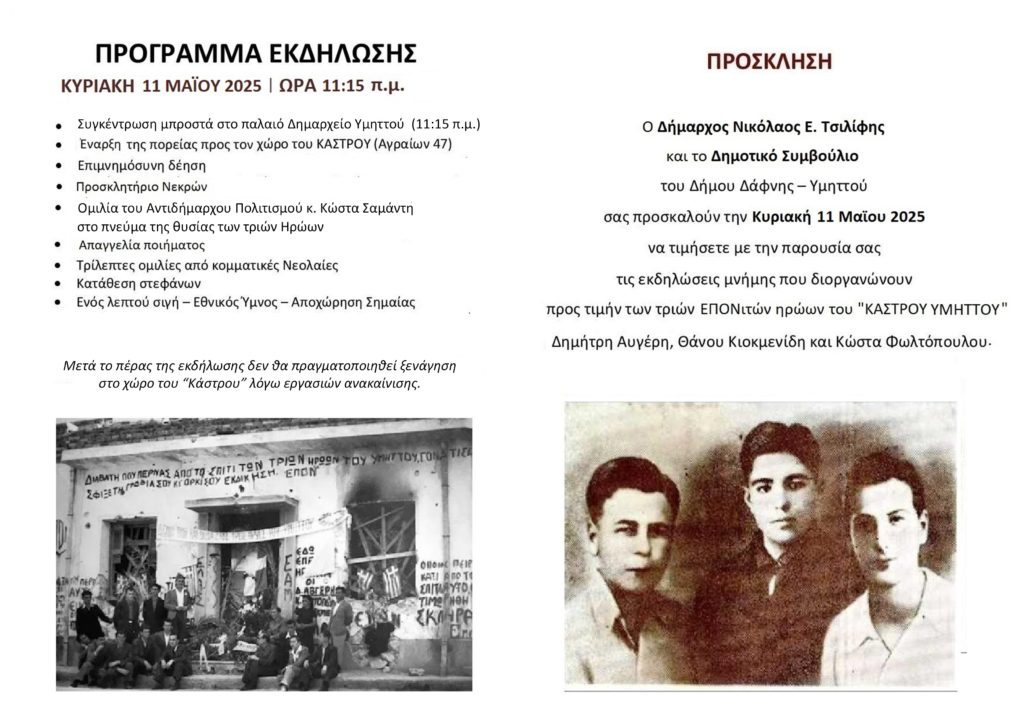 Την Κυριακή 11 Μάϊου, η δημοτική Αρχή του δήμου Δάφνης-Υμηττού διοργανώνουν εκδηλώσεις τιμής και μνήμης για τα 81 χρόνια μετά τη θυσία των τριών ΕΠΟΝιτών Ηρώων του «Κάστρου του Υμηττού».