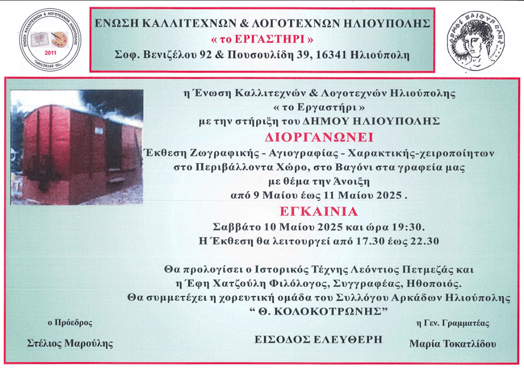Η Ένωση Καλλιτεχνών & Λογοτεχνών Ηλιούπολης «Το Εργαστήρι» παρουσιάζει μία μοναδική έκθεση, με την υποστήριξη του Δήμου Ηλιούπολης, που συνδυάζει τις τέχνες της Ζωγραφικής, Αγιογραφίας, Χαρακτικής και Χειροποίητων με θέμα την Άνοιξη.