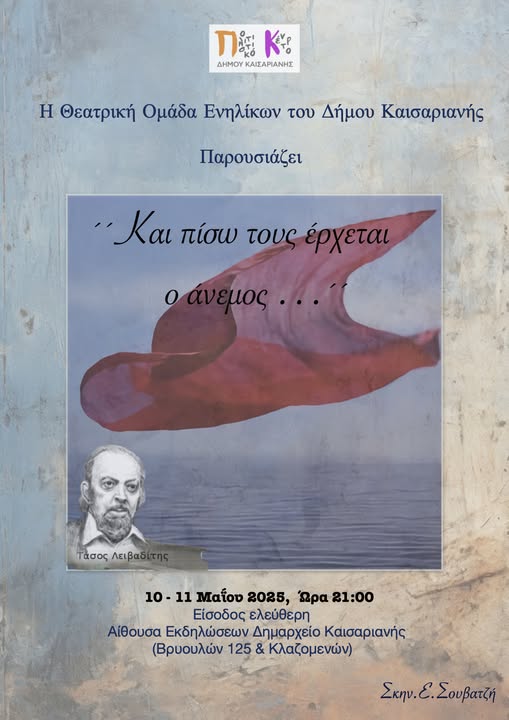 Η Θεατρική Ομάδα Ενηλίκων του Δήμου Καισαριανής παρουσιάζει την θεατρική παράσταση «Και πίσω τους έρχεται ο άνεμος…», σε σκηνοθεσία της Ευδοκία Σουβατζή.