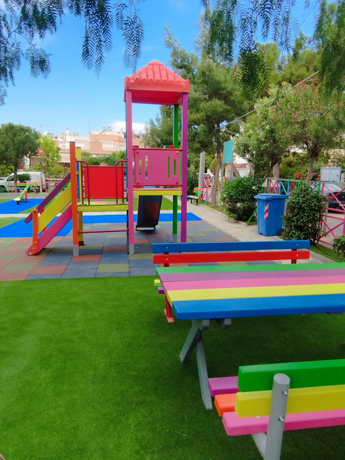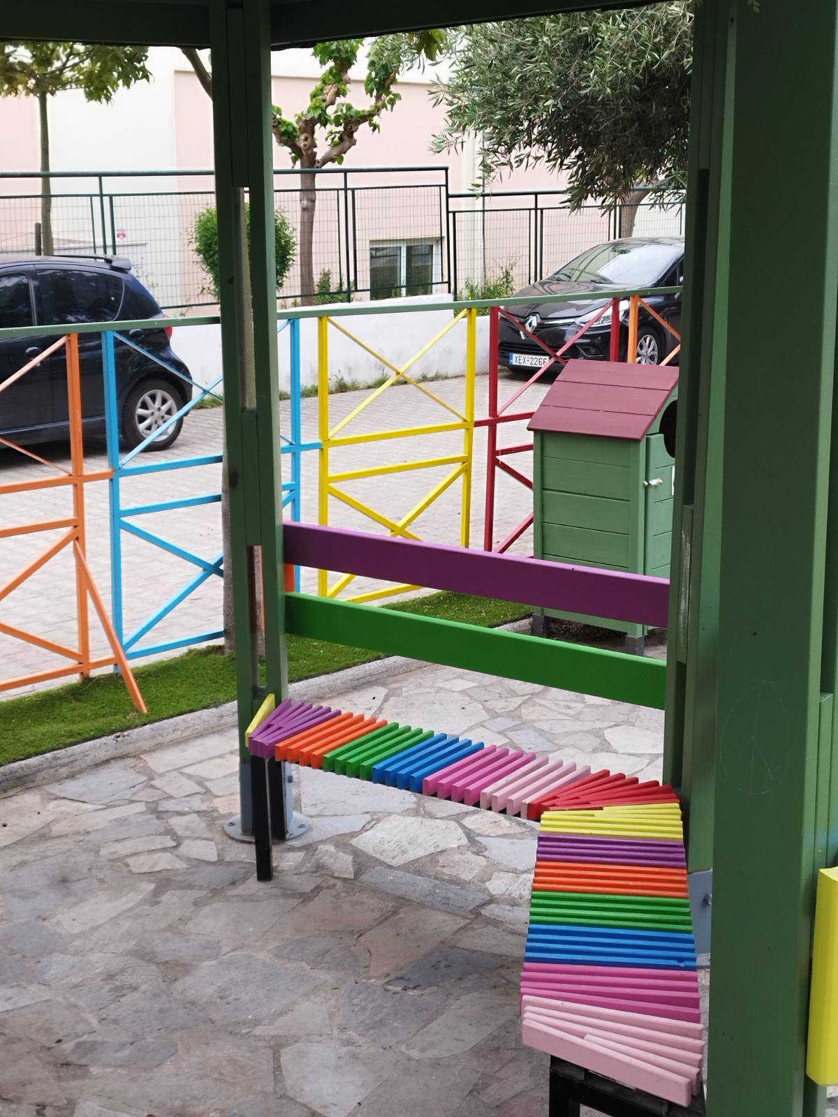 - επισκευάστηκε και βάφτηκε πολύχρωμος όλος ο εξοπλισμός (κιόσκι, παγκάκια, κάδοι κ.λπ.).