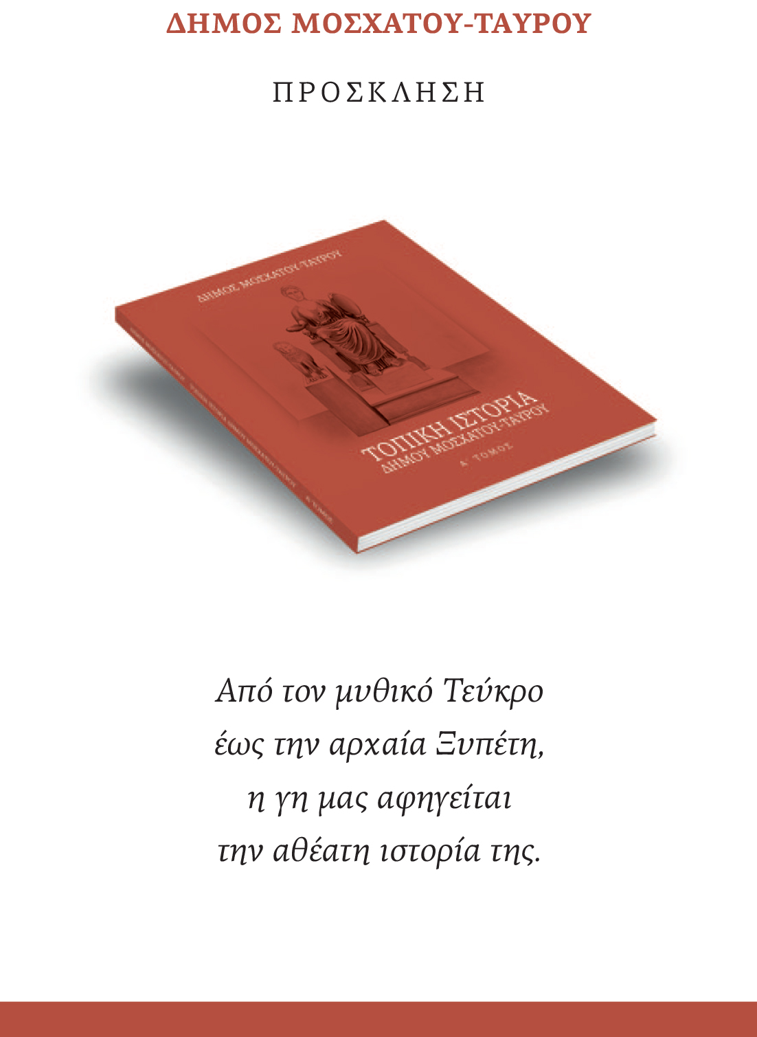 Ο Α΄ τόμος του βιβλίου Τοπικής Ιστορίας του Δήμου αποτελεί το αποτέλεσμα μακρόχρονης έρευνας και μελέτης από την Αρχαιολόγο, Δρ. Ασπασία Γκιόκα-Σπιτσιέρη και εντάσσεται σε μια ευρύτερη προσπάθεια ανάδειξης της ταυτότητας του τόπου, ένα όραμα του Δημάρχου Μοσχάτου-Ταύρου, Ανδρέα Ευθυμίου.