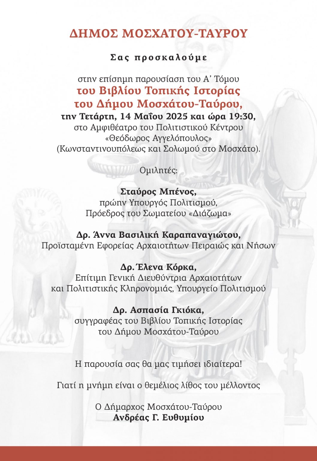 Ο Δήμαρχος Μοσχάτου-Ταύρου, Ανδρέας Ευθυμίου, προσκαλεί όλους τους δημότες να γίνουν συμμέτοχοι σε αυτή την παρουσίαση της ιστορίας του τόπου: «Η καταγραφή και η ανάδειξη της τοπικής ιστορίας δεν είναι απλώς μια ακαδημαϊκή ή πολιτιστική πράξη· είναι μια πολιτική πράξη ευθύνης απέναντι στο παρελθόν, το παρόν και το μέλλον της κοινότητάς μας. Η μνήμη μας είναι ο θεμέλιος λίθος για το μέλλον μας. Περιμένουμε σε αυτή την εκδήλωση όλους τους δημότες μας, όλων των ηλικιών, για να γνωρίσουν από κοντά και να θαυμάσουν όσα ο τόπος μας και η γη μας αφηγείται μέσα από την ιστορία της».