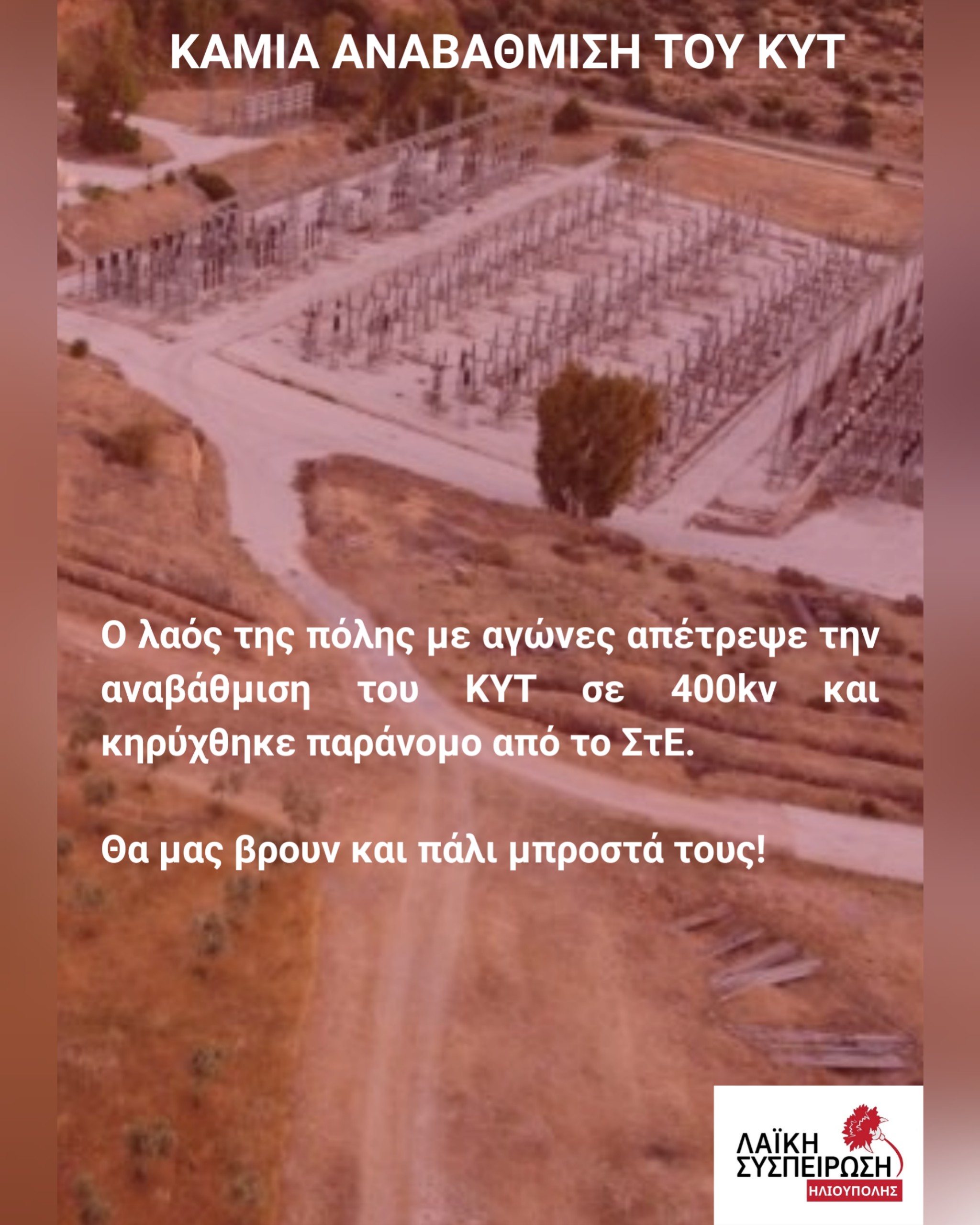 Με αφορμή τις πρόσφατες δηλώσεις του Προέδρου του ΑΔΜΗΕ σχετικά με την αναβάθμιση του Κέντρου Υπέρ Υψηλής Τάσης, ο δημοτικός σύμβουλος και επικεφαλής της Λαϊκής Συσπείρωσης Ηλιούπολης, Αλέξανδρος Μπουγάς δηλώνει την ξεκάθαρη εναντίωση της παράταξης σε οποιαδήποτε απόπειρα αναβάθμισης ή μονιμοποίησης αυτής της αυθαίρετης και επικίνδυνης εγκατάστασης, που εδώ και δεκαετίες λειτουργεί εις βάρος των πολιτών και του περιβάλλοντος.