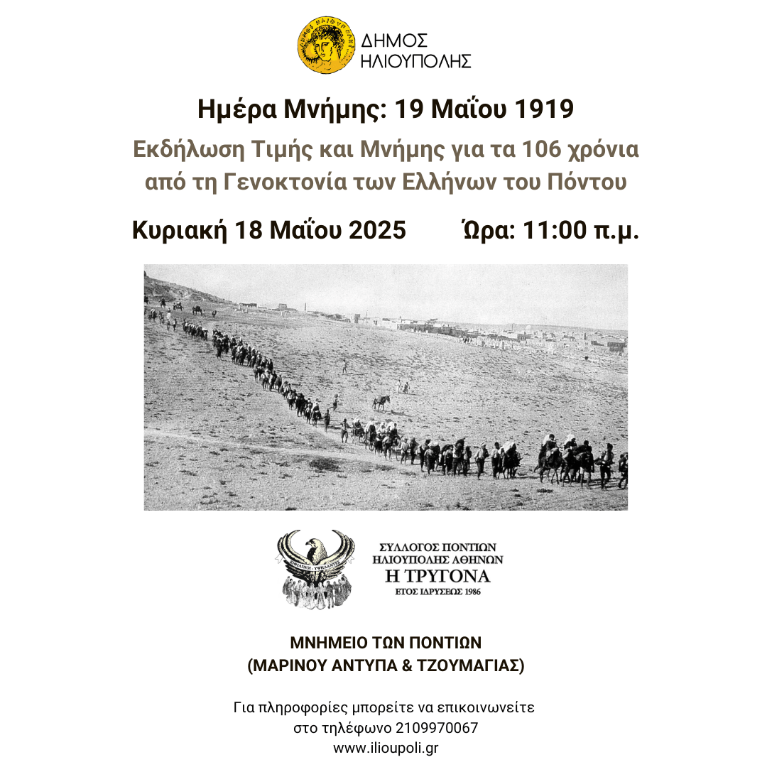 Ο Σύλλογος Ποντίων Ηλιούπολης – Αθηνών «Η Τρυγόνα» σε συνεργασία με τον Δήμο Ηλιούπολης, διοργανώνει ως ελάχιστο φόρο τιμής προς τους Έλληνες του Πόντου, μία εκδήλωση τιμής και μνήμης για τα 106 χρόνια μετά την Γενοκτονία του Ποντιακού Ελληνισμού.
