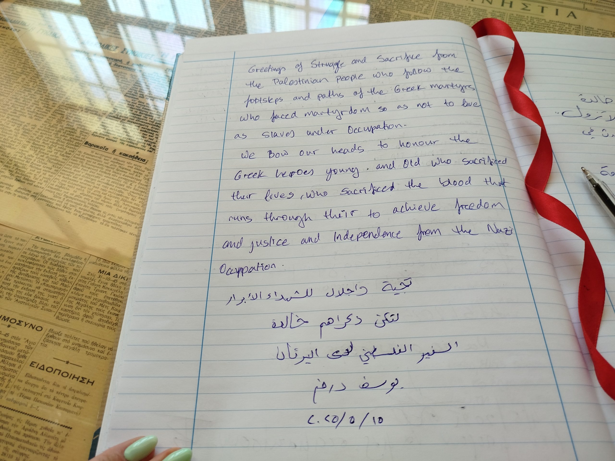 «Όσο περισσότερα μαθαίνω για την ιστορία του Ελληνικού λαού και της Καισαριανής, τόσο περισσότερο αναδεικνύονται τα κοινά στοιχεία των λαών μας και των αγώνων τους» σχολίασε χαρακτηριστικά ο πρέσβης της Παλαιστίνης. Πριν την αναχώρησή του, έγραψε στο βιβλίο επισκεπτών: «Χαιρετίζουμε θερμά τους αγώνες και τις θυσίες σας εκ μέρους τού Παλαιστινιακού λαού ο οποίος ακολουθεί τα χνάρια των Ελλήνων μαρτύρων που θυσιάστηκαν για να μην ζουν σαν σκλάβοι υπό κατοχή. Υποκλινόμαστε στους Έλληνες ήρωες όλων των ηλικιών που έδωσαν τη ζωή τους και έχυσαν το αίμα τους για την ελευθερία, τη δικαιοσύνη και την ανεξαρτησία από την ναζιστική κατοχή».