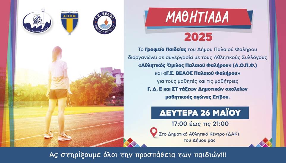 Οι Μαθητικοί Αγώνες Στίβου 2025 επιστρέφουν και φέτος στον Δήμο Παλαιού Φαλήρου, με μία σειρά αθλητικών εκδηλώσεων για τους μαθητές-τριες των Γ΄, Δ΄, Ε΄ και ΣΤ΄ τάξεων των Δημοτικών Σχολείων της πόλης.