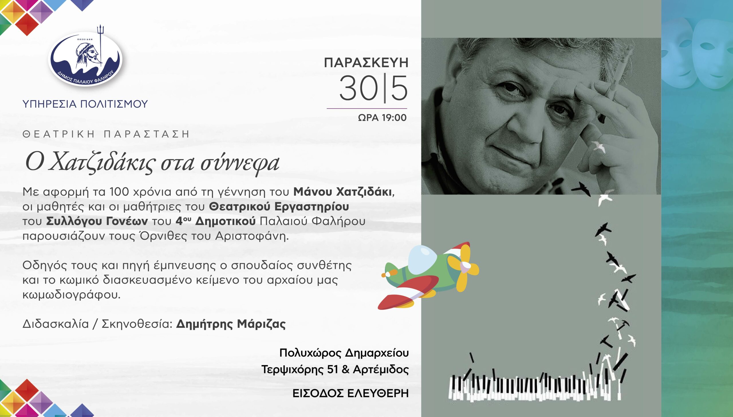 Με αφορμή τα 100 χρόνια από τη γέννηση του Μάνου Χατζιδάκι, οι μαθητές και οι μαθήτριες του Θεατρικού Εργαστηρίου του Συλλόγου Γονέων του 4ου Δημοτικού Παλαιού Φαλήρου, παρουσιάζουν τους Όρνιθες του Αριστοφάνη, με την καθοδήγηση του Δημήτρη Μαρίζα, που έχει κάνει και τη σκηνοθεσία του έργου.