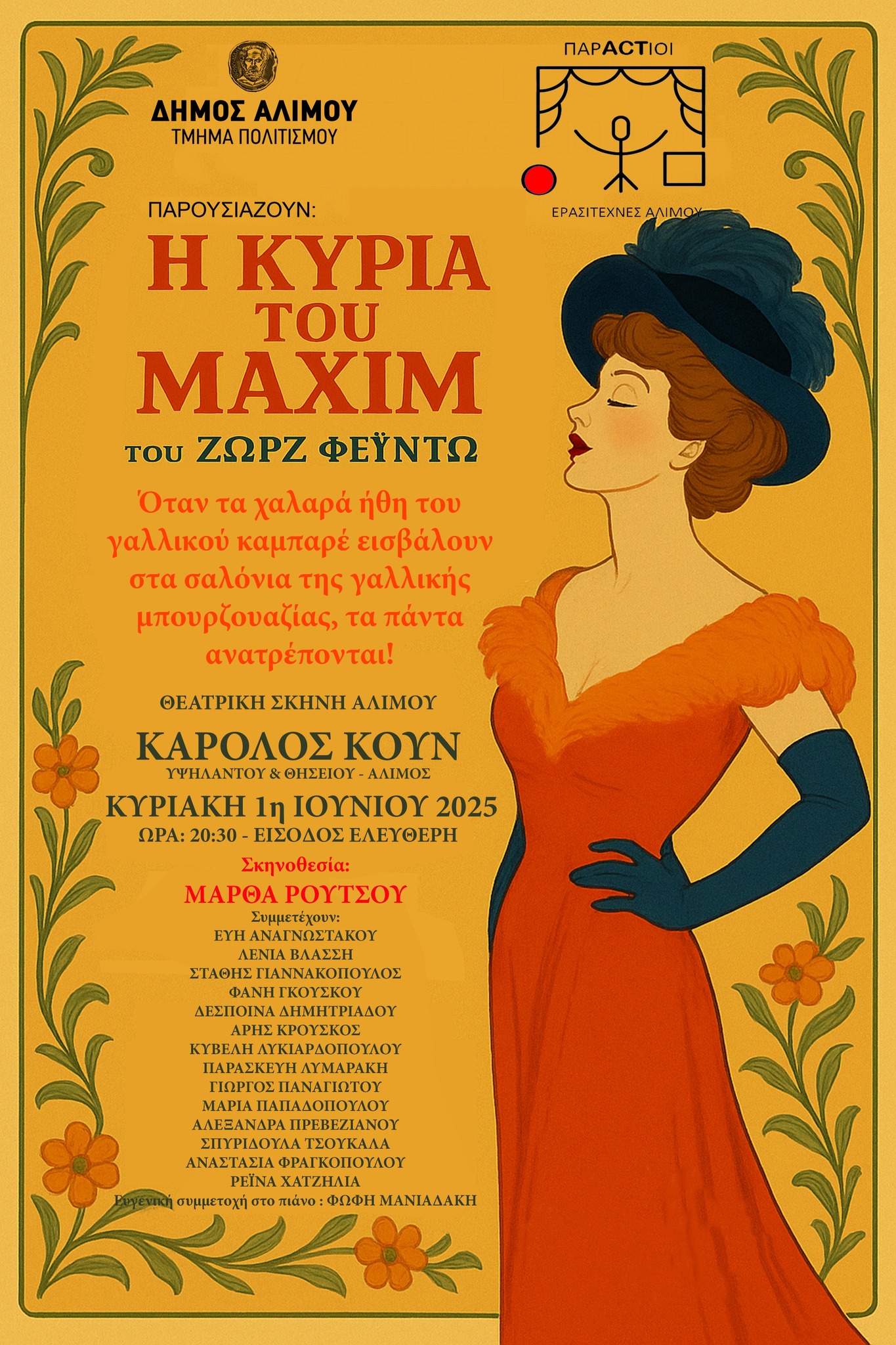 - Την Κυριακή 1η Ιουνίου 2025 και ώρα 8:30 μ.μ., στο “Κάρολος Κουν”, η θεατρική παράσταση «Η κυρία του Maxim».
