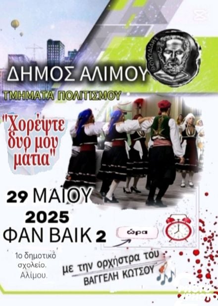 - Την Πέμπτη 29 Μαΐου 2025 και ώρα 8 μ.μ., στο 1ο Δημοτικό Σχολείο, η χορευτική παράσταση «Χορέψτε δυο μου μάτια», με ζωντανή μουσική