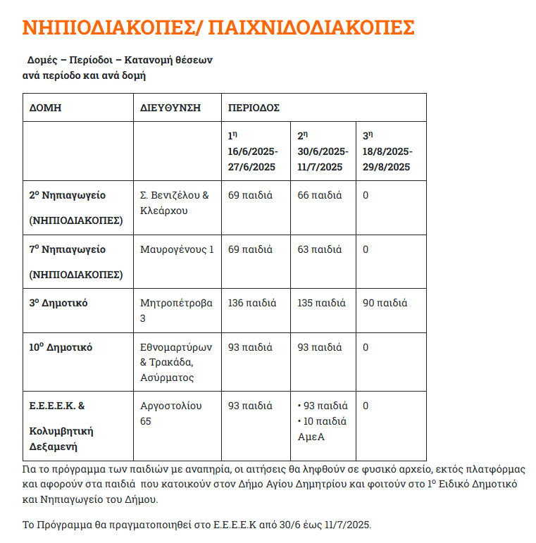 Τα προγράμματα αυτά έχουν σχεδιαστεί για να προσφέρουν στα παιδιά μας αξέχαστες καλοκαιρινές εμπειρίες, γεμάτες παιχνίδι, αθλητισμό, εικαστικές δράσεις και πολλά άλλα. Επενδύουμε στο μέλλον των παιδιών μας, εξασφαλίζοντας ένα ασφαλές και δημιουργικό περιβάλλον κατά τη διάρκεια των θερινών διακοπών. Στόχος μας είναι να δώσουμε χαρά στα παιδιά και ταυτόχρονα να στηρίξουμε τους εργαζόμενους γονείς. Σταθερά προσανατολισμένοι στην έννοια της συμπερίληψης, θα υλοποιηθούν και πρόγραμμα για παιδιά ΑμεΑ. Το συγκεκριμένο πρόγραμμα θα πραγματοποιηθεί στο ΕΕΕΕΚ (Εργαστήριο Ειδικής Επαγγελματικές Εκπαίδευσης Αγίου Δημητρίου)».