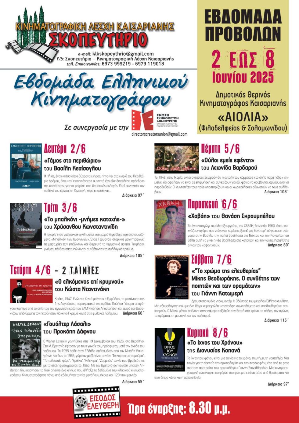 H Κινηματογραφική Λέσχη Καισαριανής «Σκοπευτήριο» διοργανώνει από την Δευτέρα 2 έως και την Κυριακή 8 Ιουνίου, στον Δημοτικό Θερινό Κινηματογράφο «Αιολία», μία εβδομάδα αφιερωμένη στον Ελληνικό Κινηματογράφο.