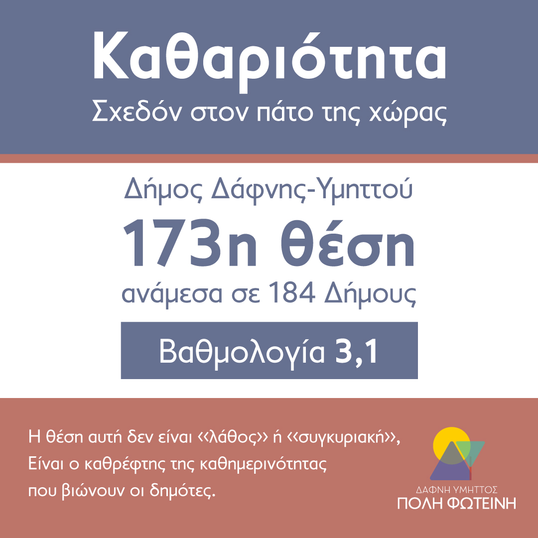 Σύμφωνα με την έκθεση αξιολόγησης δημοσίων υπηρεσιών που παρουσιάστηκε από το Υπουργείο Εσωτερικών, ο Δήμος Δάφνης-Υμηττού κατατάσσεται στην 144η θέση μεταξύ 184 Δήμων σε πανελλαδικό επίπεδο. Η συνολική βαθμολογία: 3,5 στα 10! Ενδεικτική η κατάσταση στη καθαριότητα όπου ο δήμος λαμβάνει την 173η θέση με βαθμολογία 3,1 στα 10!