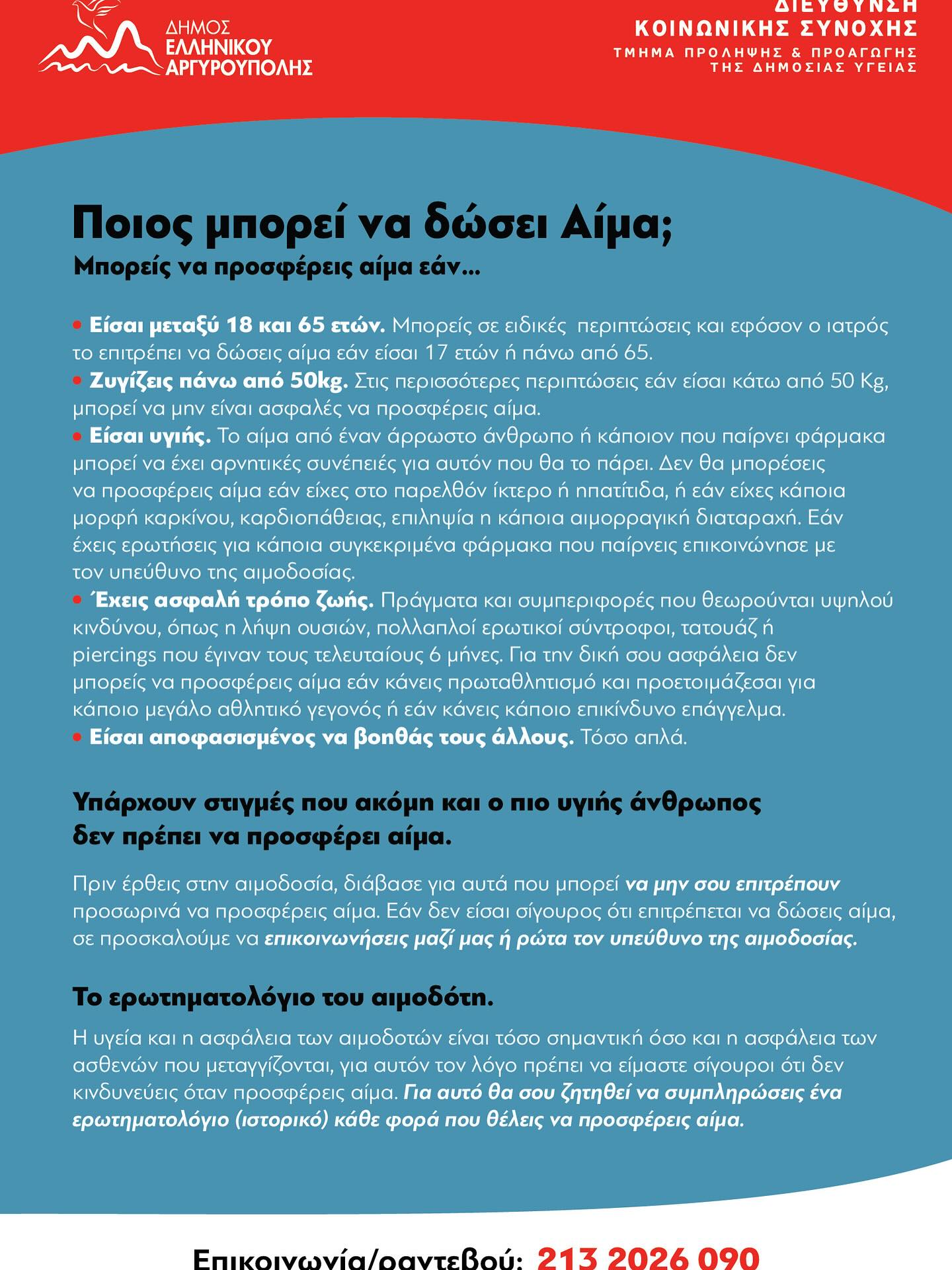 - Σε μία συμβολική ενέργεια, ο Δήμος Ελληνικού-Αργυρούπολης ανταποκρινόμενος στο κάλεσμα της Πανελλήνιας Ομοσπονδίας Συλλόγων Εθελοντών Αιμοδοτών, θα φωταγωγήσει σε χρώμα κόκκινο, το Δημαρχείο της πόλης το βράδυ της 14ης Ιουνίου 2025, στέλνοντας το μήνυμα για μία από τις μεγαλύτερες πράξεις αλτρουϊσμού, αλληλεγγύης και ευθύνης από άνθρωπο σε άνθρωπο.