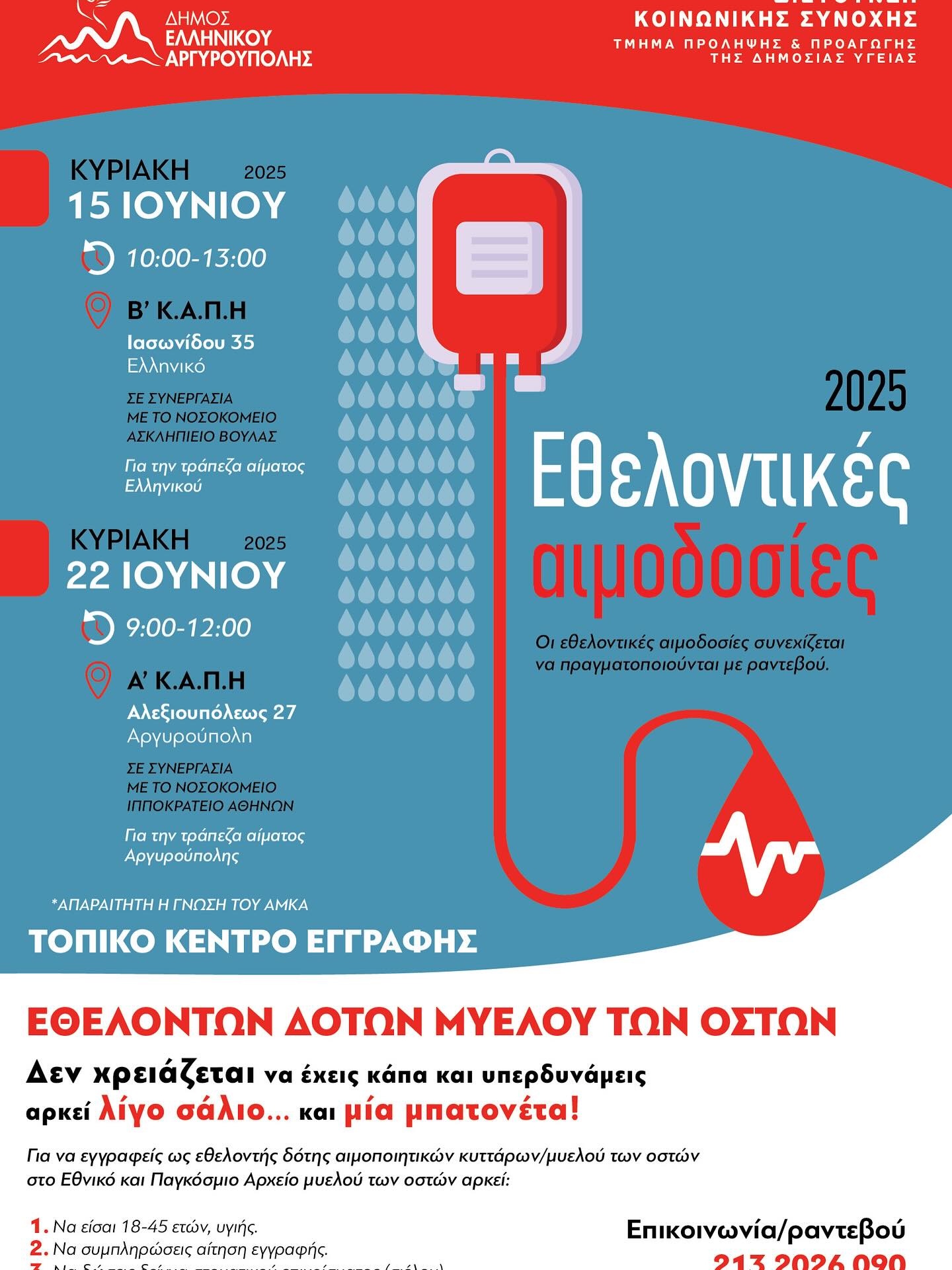 - Οργάνωση εθελοντικών αιμοδοσιών στις 15 Ιουνίου 2025 στο Β΄ Κ.Α.Π.Η., Λ. Ιασωνίδου 35, Ελληνικό και στις 22 Ιουνίου 2025 στο Α΄ Κ.Α.Π.Η. Αλεξιουπόλεως 27, Αργυρούπολη.
