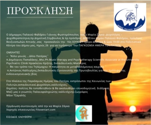 Στο πλαίσιο της Παγκόσμιας Ημέρας του Πατέρα, Εκπρόσωποι της Κοινωνίας των Πολιτών, εκπαιδευτικοί, ψυχολόγοι, καλλιτέχνες, δημότες-πολίτες θα τοποθετηθούν και ακολουθήσει διαδραστική συζήτηση.