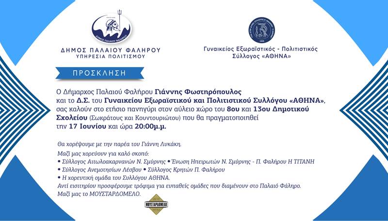 O γυναικείος εξωραϊστικός πολιτιστικός Σύλλογος Π. Φαλήρου «ΑΘΗΝΑ» διοργανώνει το ετήσιο πανηγύρι του, που θα πραγματοποιηθεί την Τρίτη 17 Ιουνίου και ώρα 20:00 μ.μ., στον στον αύλειο χώρο του 8ου και 13ου Δημοτικού Σχολείου Παλαιού Φαλήρου (Σωκράτους και Κουντουριώτου).