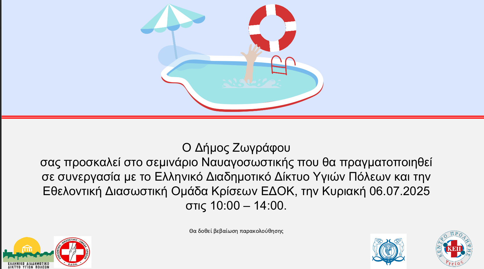 Ο Δήμος Ζωγράφου διοργανώνει το εξαιρετικά χρήσιμο σεμινάριο «Γνωριμία με τη Ναυαγοσωστική», την Κυριακή 06 Ιουλίου και ώρα 10:00-14:00, στο Δημοτικό Ιλίσιο Κολυμβητήριο.