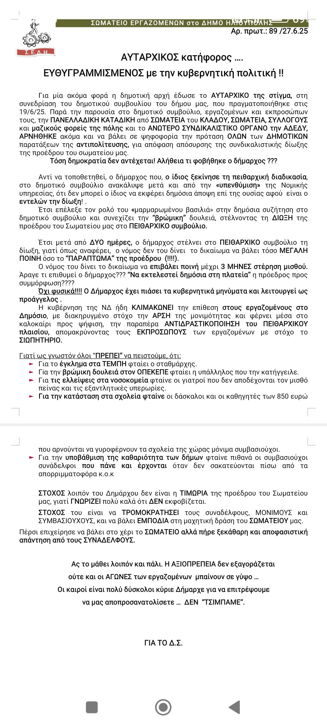 Για μία ακόμα φορά η δημοτική αρχή έδωσε το ΑΥΤΑΡΧΙΚΟ της στίγμα, στη συνεδρίαση του δημοτικού συμβουλίου του δήμου μας, που πραγματοποιήθηκε στις 19/6/25. Παρά την παρουσία στο δημοτικό συμβούλιο, εργαζομένων και εκπροσώπων τους, την ΠΑΝΕΛΛΑΔΙΚΗ ΚΑΤΑΔΙΚΗ από ΣΩΜΑΤΕΙΑ του ΚΛΑΔΟΥ, ΣΩΜΑΤΕΙΑ, ΣΥΛΛΟΓΟΥΣ και μαζικούς φορείς της πόλης και το ΑΝΩΤΕΡΟ ΣΥΝΔΙΚΑΛΙΣΤΙΚΟ ΟΡΓΑΝΟ την ΑΔΕΔΥ, ΑΡΝΗΘΗΚΕ ακόμα και να βάλει σε ψηφοφορία την πρόταση ΟΛΩΝ των ΔΗΜΟΤΙΚΩΝ παρατάξεων της αντιπολίτευσης, για απόφαση απόσυρσης της συνδικαλιστικής δίωξης της προέδρου του σωματείου μας.