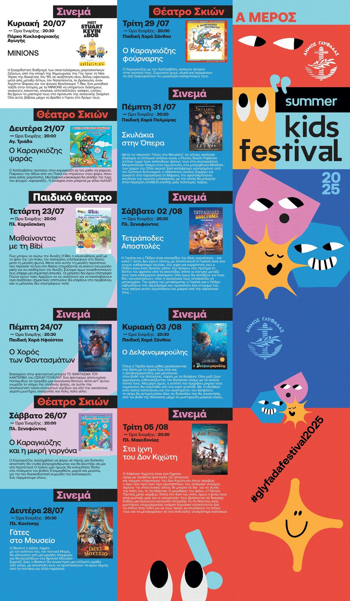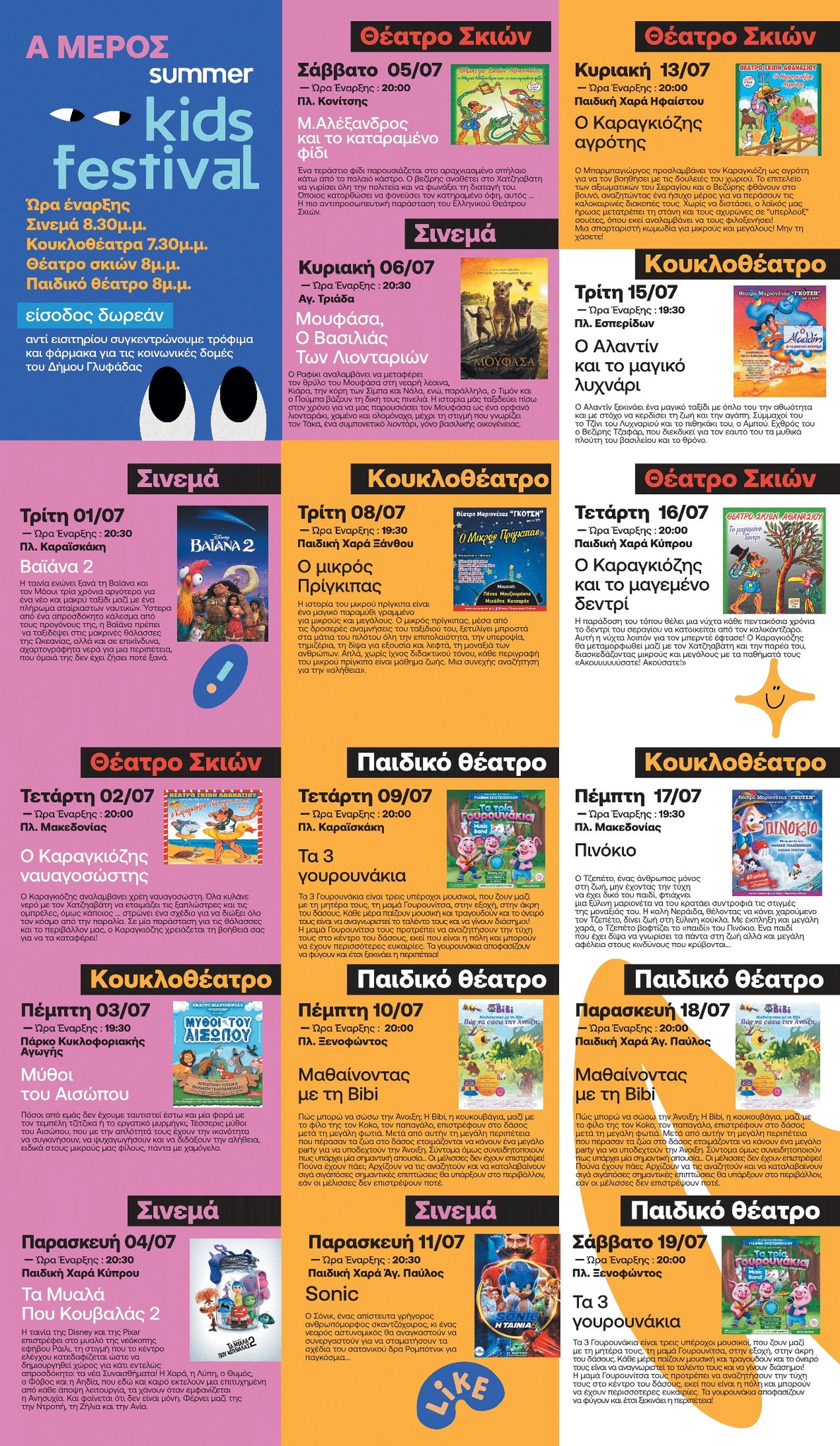 Το α’ μέρος του #Summer_Kids_Festival περιλαμβάνει 11 κινηματογραφικές ταινίες, 5 θεατρικές παραστάσεις, 7 παραστάσεις Καραγκιόζη, 4 Κουκλοθέατρα και ολοκληρώνεται στις 5 Αυγούστου. Ακολουθεί το β΄μέρος, με μια ολιγοήμερη διακοπή τον Αύγουστο.