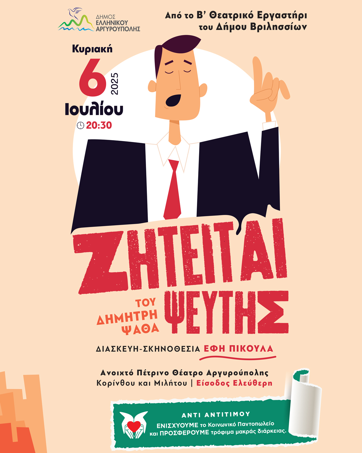 Μια ξεκαρδιστική θεατρική βραδιά γεμάτη σάτιρα και ανατροπές ετοιμάζει ο Δήμος Ελληνικού – Αργυρούπολης, παρουσιάζοντας την κωμωδία «Ζητείται Ψεύτης», του Δημήτρη Ψαθά, σε διασκευή και σκηνοθεσία της Έφης Πίκουλα.