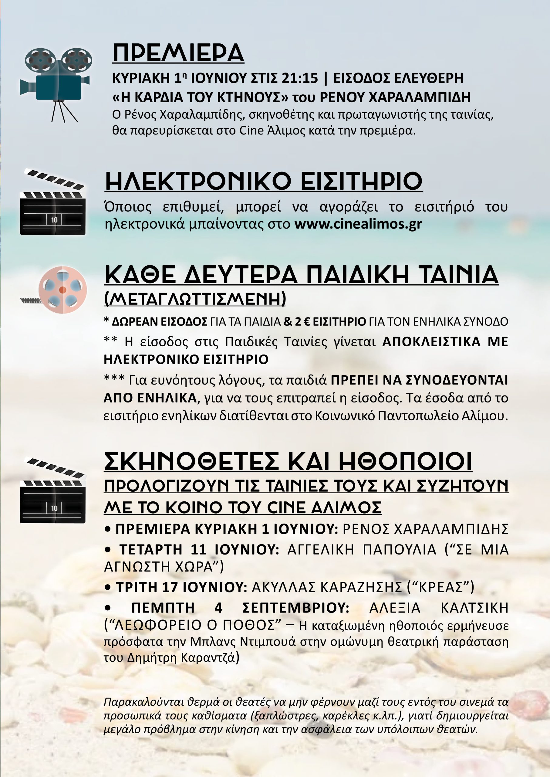 Υποχρεωτική κράτηση τις Δευτέρες: Στις παιδικές προβολές που πραγματοποιούνται κάθε Δευτέρα, η ηλεκτρονική κράτηση είναι υποχρεωτική τόσο για τα παιδιά όσο και για τους ενήλικες συνοδούς, λόγω αυξημένης προσέλευσης. Για ευνόητους λόγους, τα παιδιά ΠΡΈΠΕΙ ΝΑ ΣΥΝΟΔΕΎΟΝΤΑΙ ΑΠΌ ΕΝΉΛΙΚΑ, για να τους επιτραπεί η είσοδος. Τα έσοδα από το εισιτήριο ενηλίκων διατίθενται στο Κοινωνικό Παντοπωλείο Αλίμου.