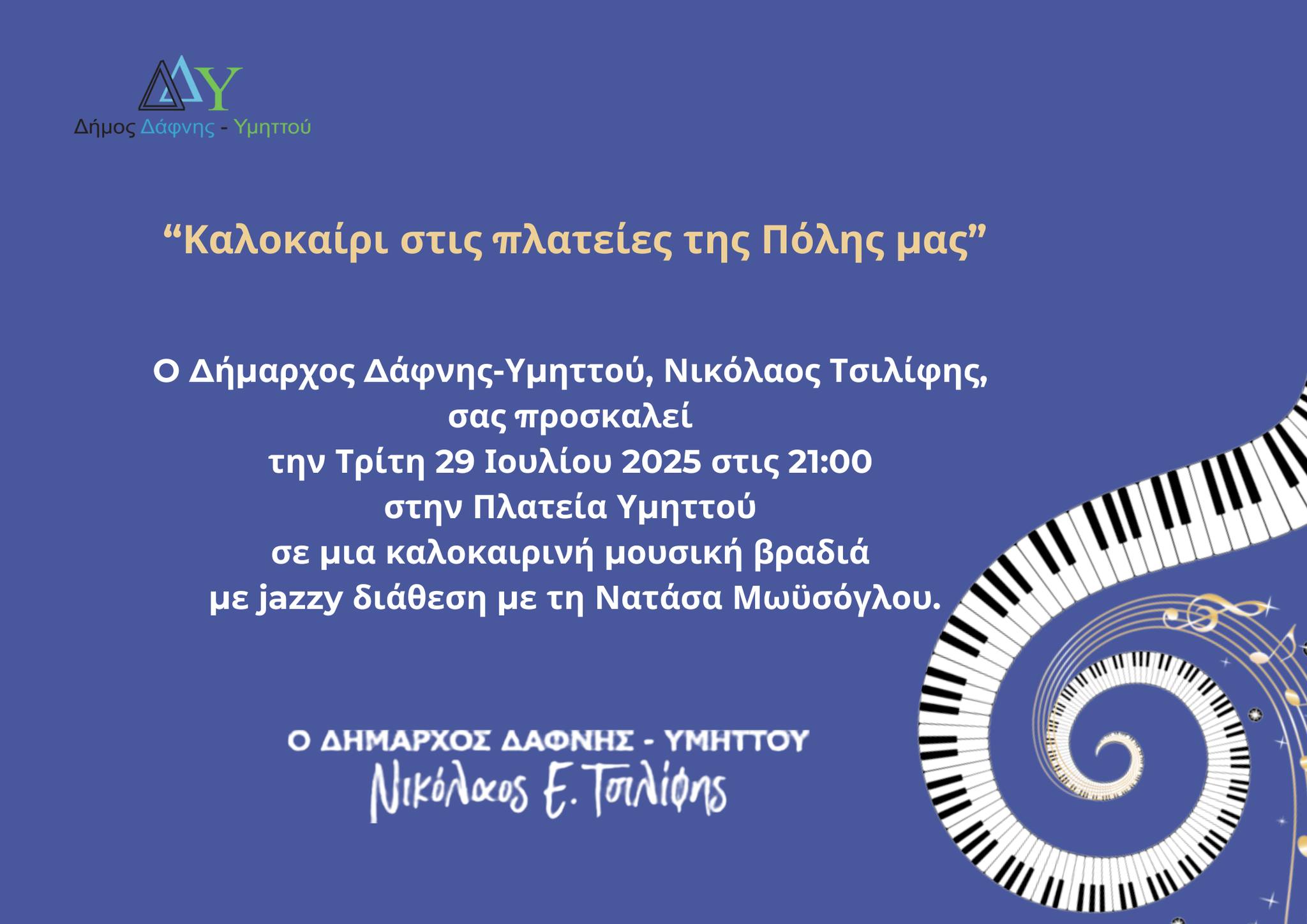 Ο Δήμαρχος Δάφνης-Υμηττού, Νικόλαος Τσιλίφης, βρίσκεται δίπλα στους δημότες, «μέσα από εκδηλώσεις που δίνουν πνοή στις πλατείες μας και τις μετατρέπουν σε σημείο συνάντησης μικρών και μεγάλων, με στόχο μια πόλη ζωντανή, συμμετοχική και πολιτιστικά ενεργή, ενισχύοντας τον κοινωνικό ιστό και την ποιότητα ζωής των συμπολιτών μας. Ελάτε να ζήσουμε μια καλοκαιρινή βραδιά γεμάτη μουσική και υπέροχες μελωδίες!».