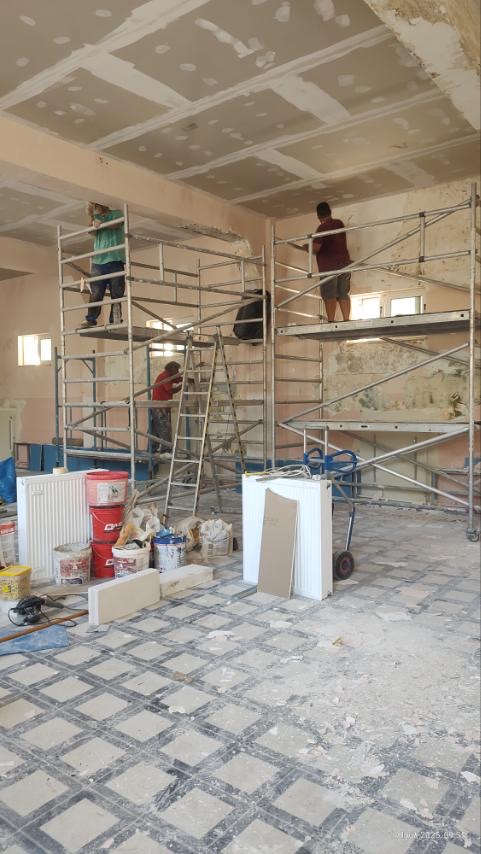 Επιπλέον, συνεχίζονται οι εργασίες ανακαίνισης της αίθουσας εκδηλώσεων του 1ου Δημοτικού, στο πλαίσιο της δωρεάς του κου Ανδρινόπουλου.