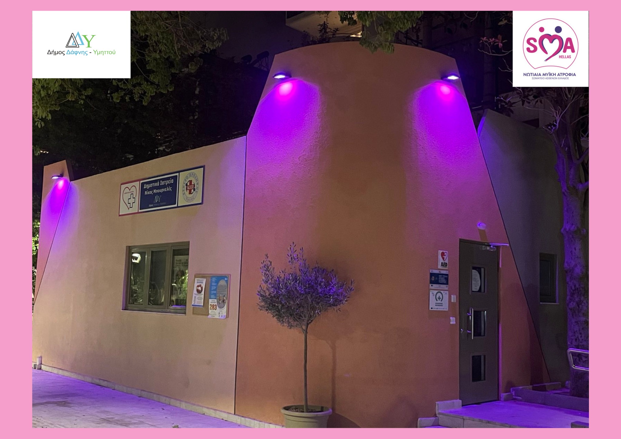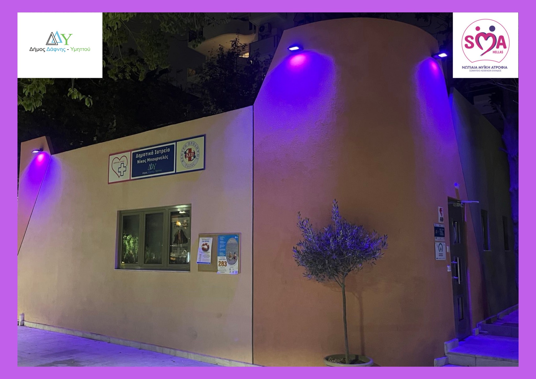 Στο πλαίσιο της δράσης ευαισθητοποίησης για την Παγκόσμια Ημέρα Ενημέρωσης και Ευαισθητοποίησης για τη Νωτιαία Μυϊκή Ατροφία (SMA), ο Δήμος Δάφνης-Υμηττού φωταγωγεί με χρώματα φούξια & μοβ το ΚΕΠ Υγείας, για να στείλουμε όλοι μαζί ένα δυνατό μήνυμα συμπερίληψης, γνώσης και αλληλεγγύης.