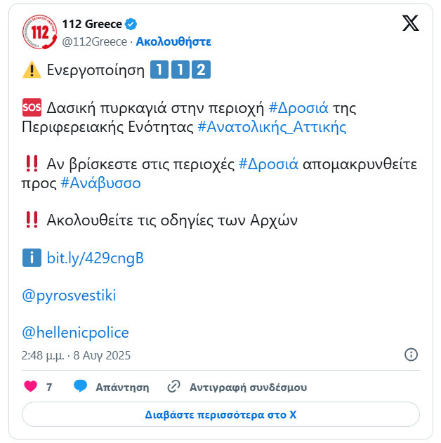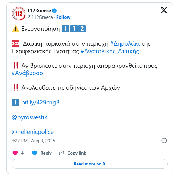 Μήνυμα του 112 για εκκένωση των περιοχών Λεγρενά, Χάρακα, Τριανταφυλλιά και Θυμάρι. Οι κάτοικοι της περιοχής καλούνται να απομακρυνθούν προς το Σούνιο, μέσω της παραλιακής οδού.