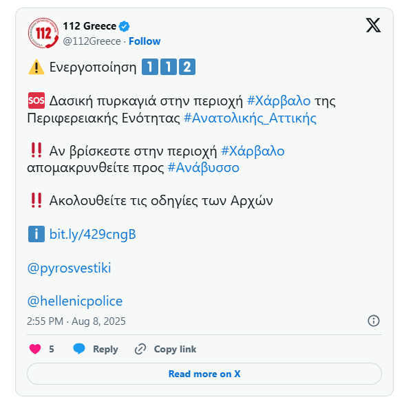 Λίγο νωρίτερα, εστάλη στους κάτοικους μήνυμα 112 για εκκένωση από τη Δροσιά προς Ανάβυσσο. Έπειτα, ακολούθησε δεύτερο μήνυμα από το 112 στους κατοίκους της περιοχής Χάρβαλο, αυτή τη φορά, για να εκκενώσουν επίσης προς Ανάβυσσο.