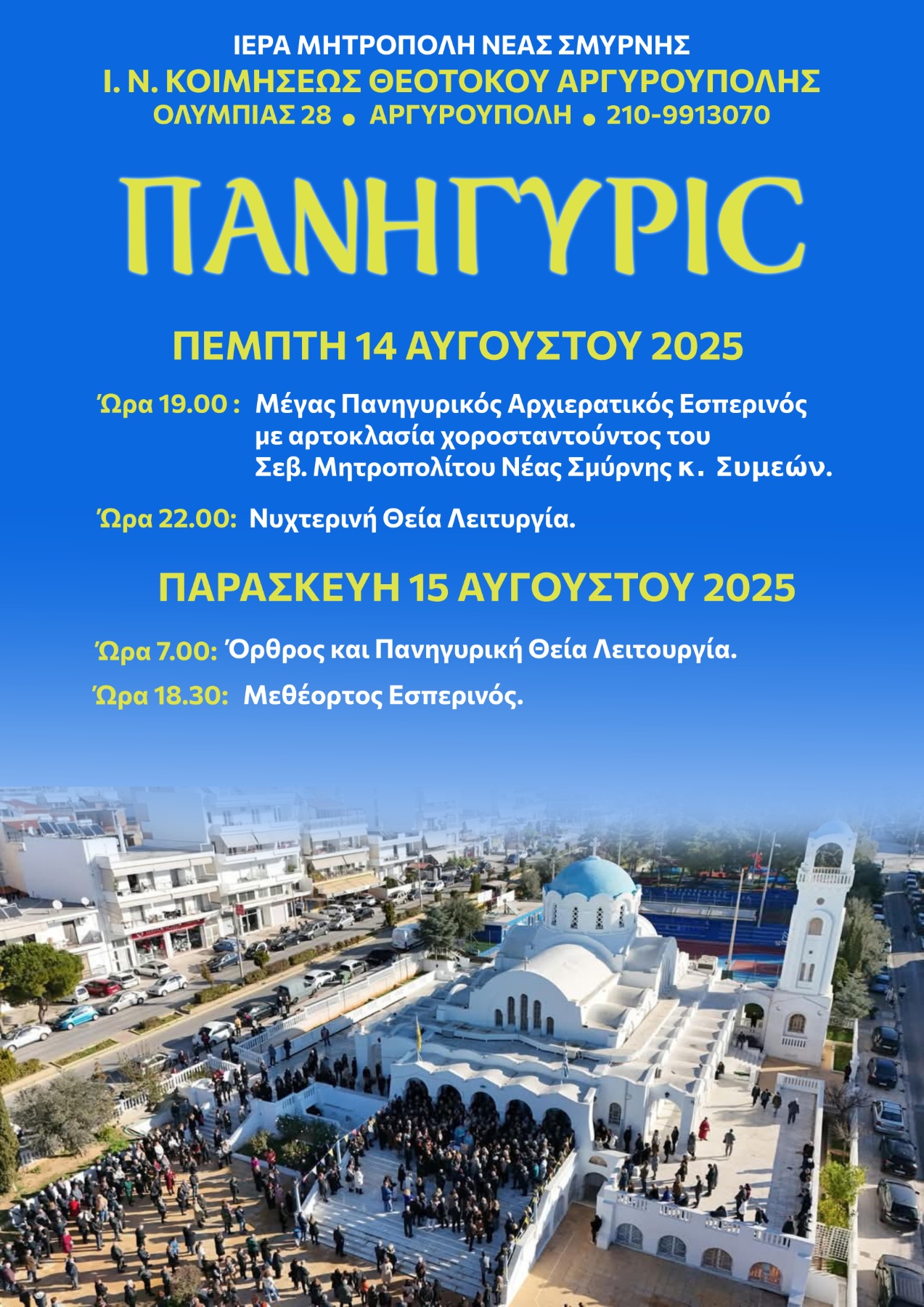 Την Πέμπτη 14 Αυγούστου και ώρα 19.00 θα τελεσθεί Μέγας Πανηγυρικός Αρχιερατικός Εσπερινός με αρτοκλασία Χοροστατούντος του Σεβασμιότατου Μητροπολίτου Νέας Σμύρνης κ. Συμεών.