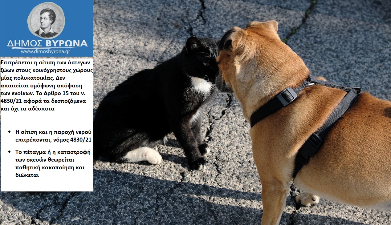 Ο Δήμος Βύρωνα, στο πλαίσιο του προγράμματος φροντίδας και προστασίας των αδέσποτων ζώων και της καλοκαιρινής περιόδου, που οι ανάγκες των ζώων είναι μεγαλύτερες, ενημερώνει τους δημότες σχετικά με το νομικό πλαίσιο που αφορά τη φροντίδα των αδέσποτων ζώων σε κοινόχρηστους χώρους πολυκατοικιών.