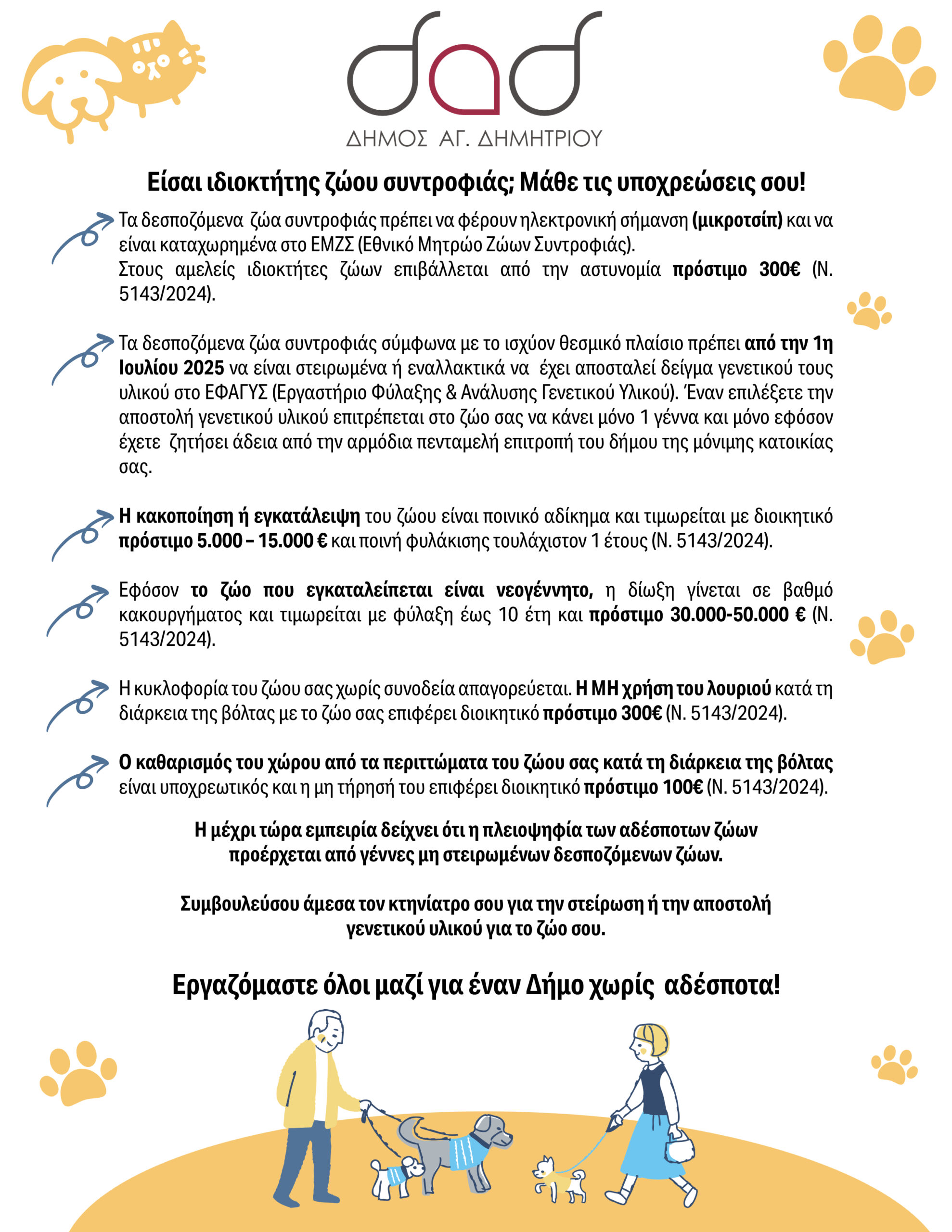 Το Τμήμα Αστικής Πανίδας του Δήμου Αγίου Δημητρίου, με πρωτοβουλία του αρμόδιου αντιδημάρχου Γιώργου Ταμπακόπουλου, ετοίμασε ένα ενημερωτικό φυλλάδιο που αφορά στις υποχρεώσεις των φιλόζωων απέναντι στα δεσποζόμενα ζώα, αλλά και την προστασία των αδέσποτων.