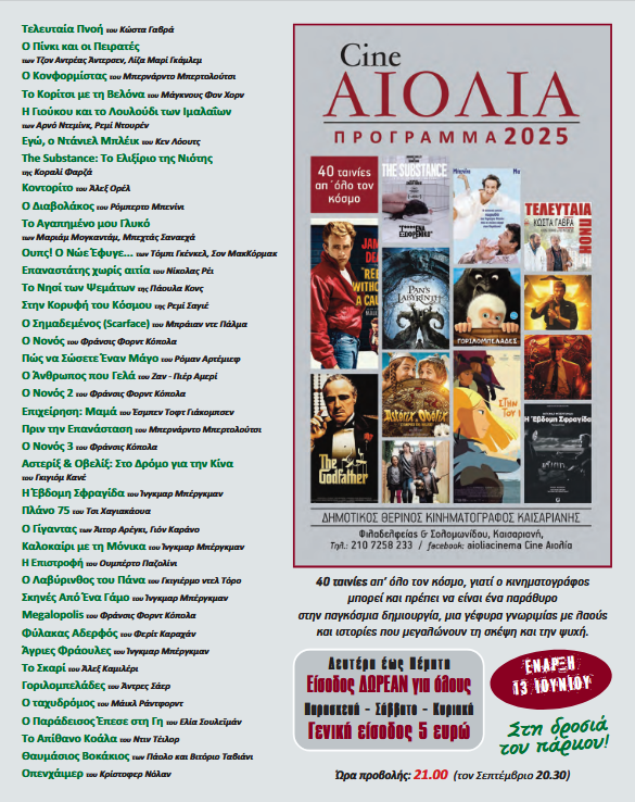 Ο Δημοτικός Θερινός Κινηματογράφος «Cine Αιολία» του Δήμου Καισαριανής συνεχίζει τις καλοκαιρινές προβολές και το μήνα του Αυγούστου, με μία μεγάλη γκάμα ταινιών, από κάθε άκρη του κόσμου.