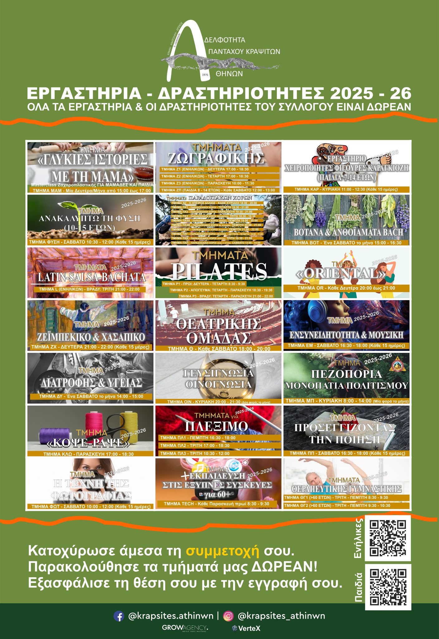 Η Αδελφότητα Απανταχού Κραψιτών Αθηνών διοργανώνει και φέτος εργαστήρια για μικρούς και για μεγάλους για τη χρονιά 2025-2026. Ο πυρήνας του σχεδιασμού των εργαστηρίων 2025-2026, βασίζεται σε ένα όραμα ανοιχτό, συμμετοχικό και χωρίς αποκλεισμούς.