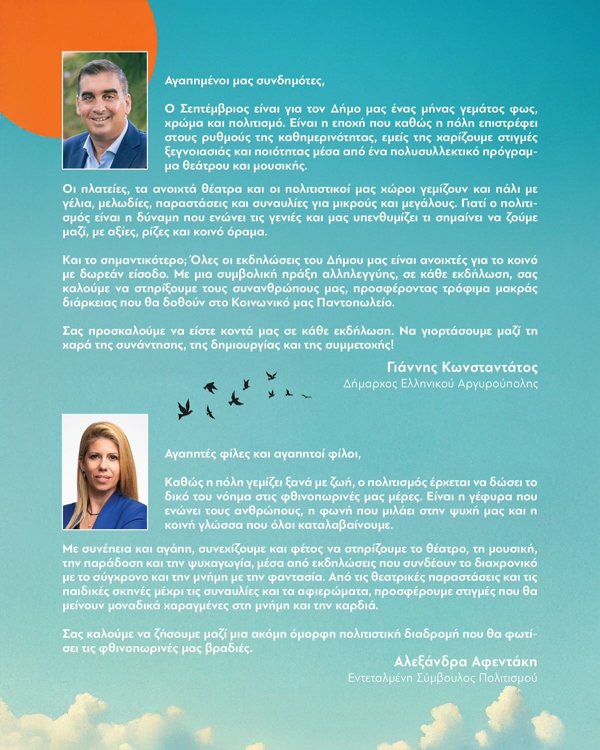 Ο πολιτισμός είναι η δύναμη που μας ενώνει, μας εμπνέει και μας θυμίζει τι σημαίνει να ζούμε με αξίες, ρίζες και κοινό όραμα. Σας καλούμε όλους να γιορτάσουμε μαζί τη χαρά της συνάντησης, της δημιουργίας και της συμμετοχής».
