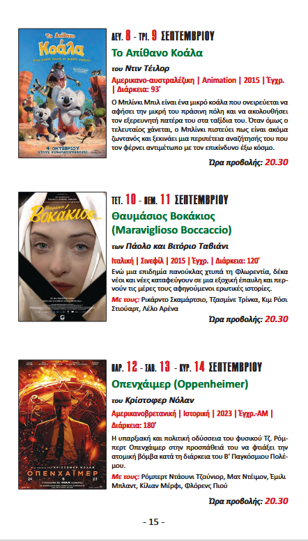 Δείτε, παρακάτω, αναλυτικά το πρόγραμμα προβολών έως τις 14 Σεπτεμβρίου: