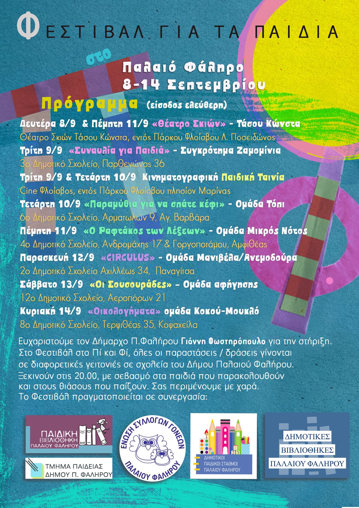 «Με την σκέψη μας στα παιδιά, σε μία προσπάθεια να τα φέρουμε κοντά σε σημαντικούς παιδικούς θιάσους και καλλιτέχνες δημιουργήσαμε το “Φεστιβάλ στο Πι και Φι” , ένα Φεστιβάλ για Παιδιά, στο Παλαιό Φάληρο, προσπαθώντας να δώσουμε “φώς” σε πολλές γειτονιές και μία διαφορετική χρήση στις αυλές των σχολείων μας λίγο πριν ξεκινήσει η εκπαιδευτική χρονιά.