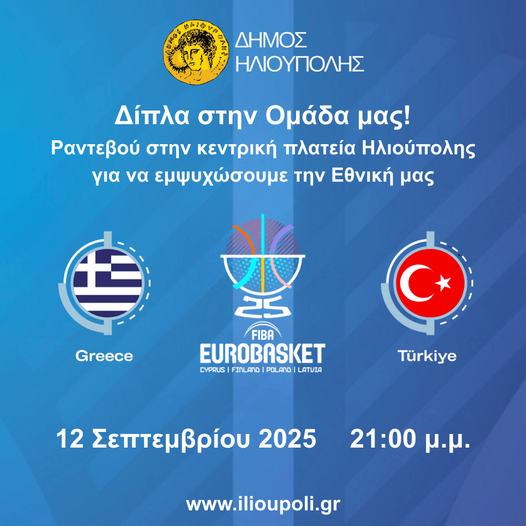 Ο Δήμος κλείνει ραντεβού με όλους την Παρασκευή 12 Σεπτεμβρίου 2025 στις 21:00 μ.μ., στην κεντρική πλατεία Ηλιούπολης για να εμψυχώσουν όλοι μαζί την Εθνική Ομάδα, στον μεγάλο ημιτελικό του EuroBasket απέναντι στην Τουρκία.
