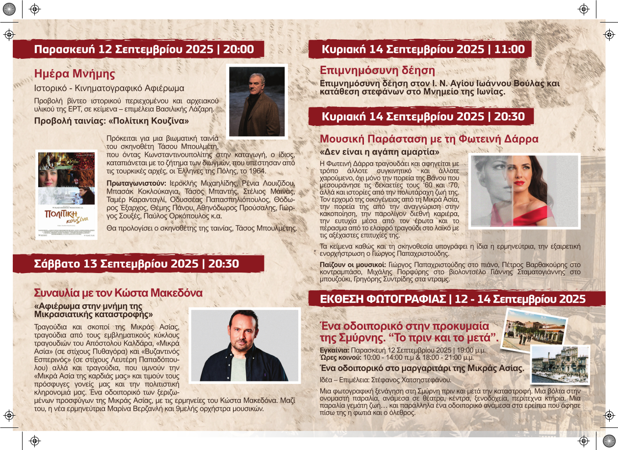 Όλες οι εκδηλώσεις έχουν ελεύθερη είσοδο και θα πραγματοποιηθούν σε κεντρικούς πολιτιστικούς χώρους της Βούλας (Πλατεία Ιμίων, Πνευματική Εστία Βούλας, Μνημείο Ιωνίας).