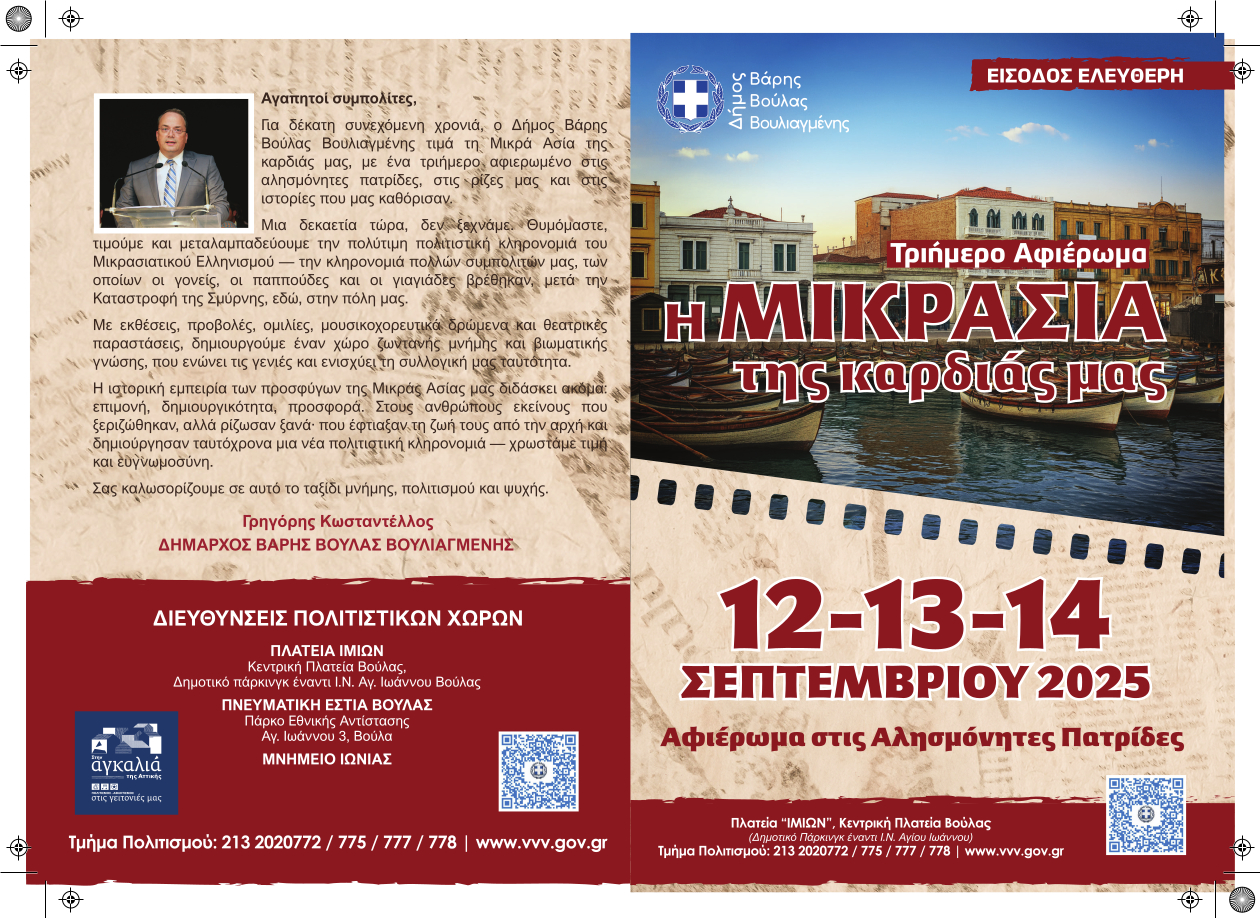 Ο Δήμος Βάρης Βούλας Βουλιαγμένης, για δέκατη συνεχή χρονιά, τιμά τη Μικρά Ασία και τις αλησμόνητες πατρίδες, με ένα τριήμερο εκδηλώσεων μνήμης και πολιτισμού, που θα πραγματοποιηθούν στις 12, 13 και 14 Σεπτεμβρίου 2025, με τίτλο: «Η Μικρασία της καρδιάς μας».