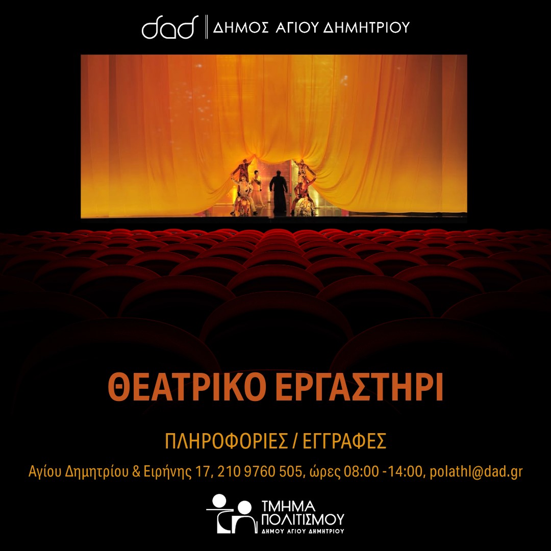 Έχουν ανοίξει οι εγγραφές για τα τμήματα θεάτρου του Δήμου Αγίου Δημητρίου για παιδιά, εφήβους και ενήλικες. Στο τμήμα Πολιτισμού του Δήμου Αγίου Δημητρίου λειτουργούν: