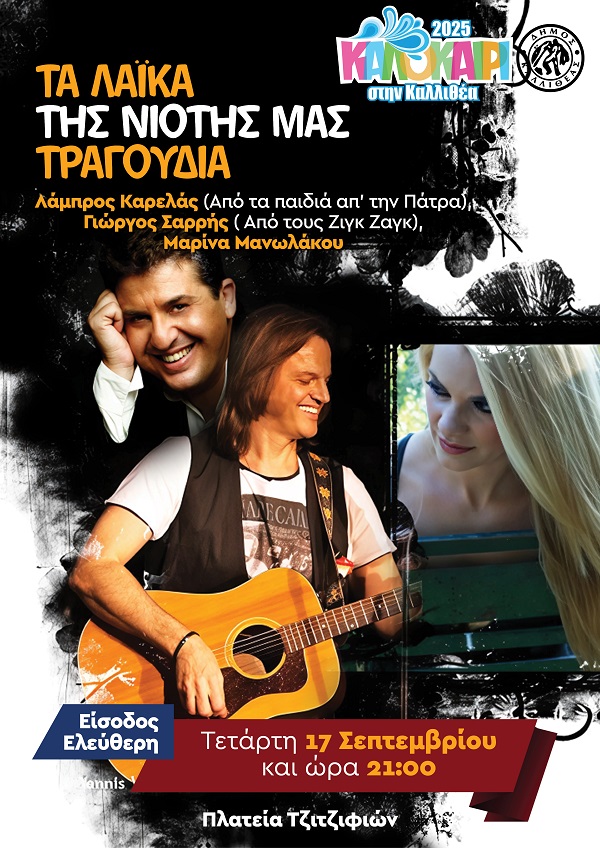 Ο Λάμπρος Καρελάς (από τα παιδιά από την Πάτρα), ο Γιώργος Σαρρής (από τους Ζικ-Ζακ) και η Μαρίνα Μανωλάκου, θα δώσουν μια μοναδική συναυλία.