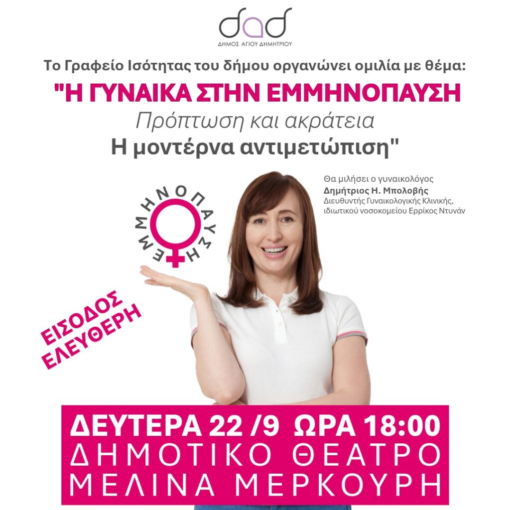 Το Γραφείο Ισότητας του Δήμου Αγίου Δημητρίου οργανώνει τη Δευτέρα 22 Σεπτεμβρίου στις 18:00 στο Δημοτικό Θέατρο Μελίνα Μερκούρη, μία ομιλία με θέμα «Η γυναίκα στην εμμηνόπαυση – Πρόπτωση και ακράτεια – Η μοντέρνα αντιμετώπιση».