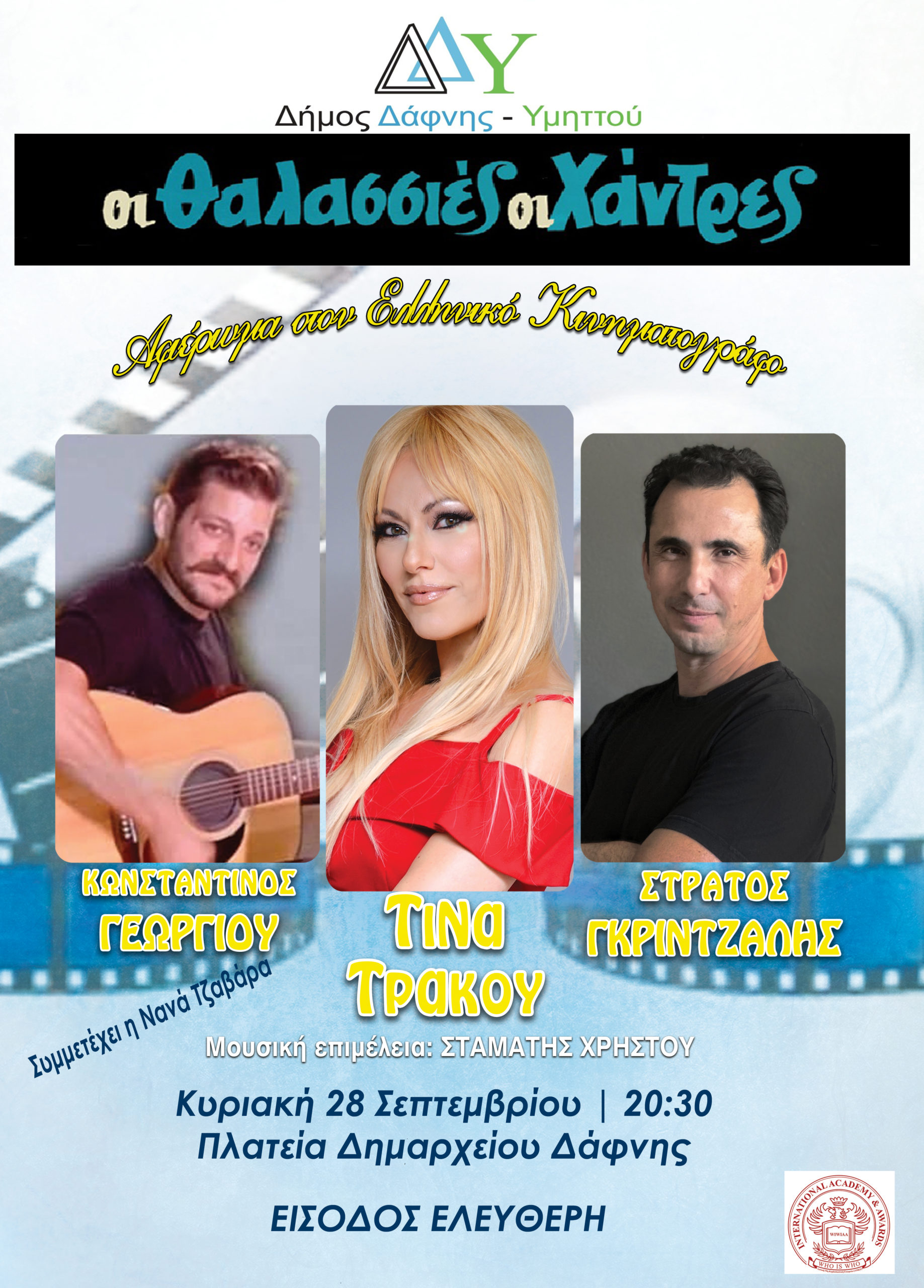 Η Τίνα Τράκου, ο Κωνσταντίνος Γεωργίου, ο Στράτος Γκρίντζαλης και η Νανά Τζαβάρα έρχονται την Κυριακή 28 Σεπτεμβρίου στις 20:30 στην Πλατεία Δημαρχείου Δάφνης.