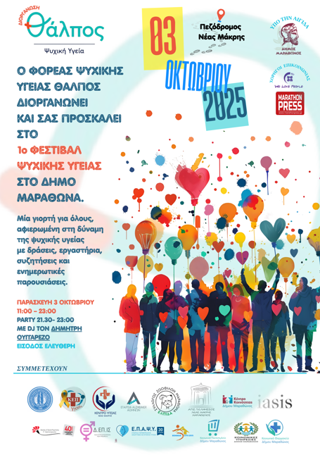 Ο Φορέας Θάλπος Ψυχική Υγεία με ιδιαίτερη χαρά ανακοινώνει τη διοργάνωση του 1ου Φεστιβάλ Ψυχικής Υγείας που θα πραγματοποιηθεί στον Δήμο Μαραθώνος την Παρασκευή 3 Οκτωβρίου 2025.